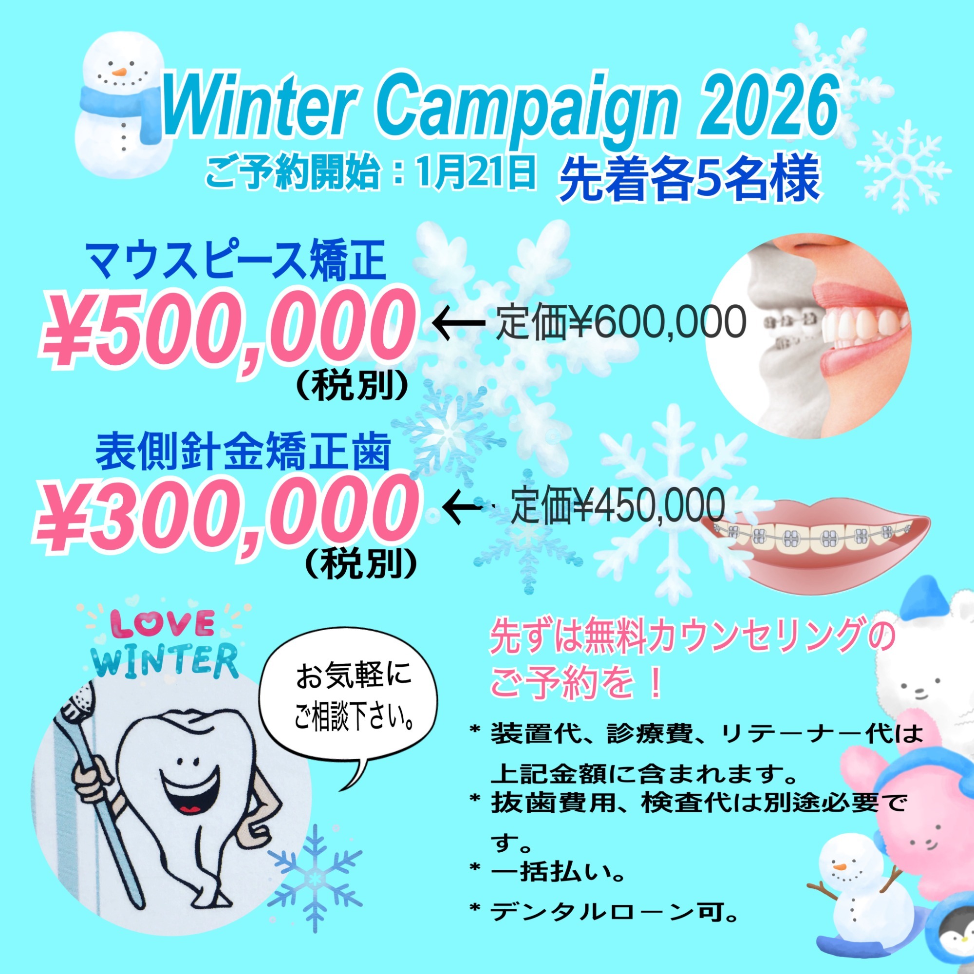 ■2026/01/16 冬のキャンペーン! 1月21日より無料カウンセリングのご予約を開始致します。歯並びについてお悩みの方、どうぞお気軽にご相談ください。